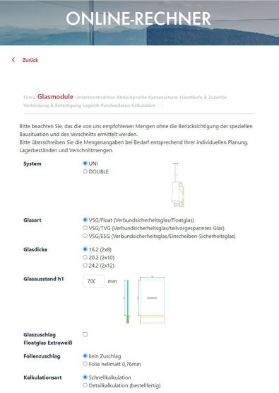 Glas Marte's online calculator ensures maximum cost transparency. In just a few steps, customers can configure the desired railing module with all components and generate quotations. The configurator provides a realistic and quick estimate and is available 24 hours a day. This means that the customer is always aware of the costs.