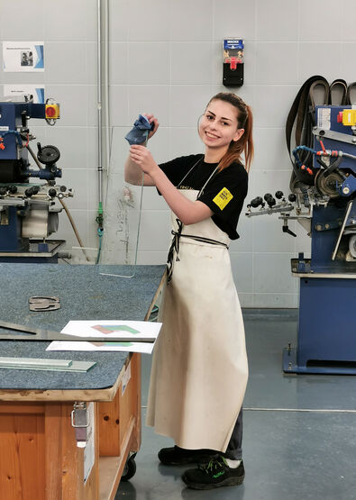Der Wettbewerb begann am Mittwochnachmittag mit einem theoretischen Teil zum Thema «Duschverglasungen», einschließlich einer Zeichenaufgabe in AutoCAD. Am Donnerstag wurden die praktischen Fähigkeiten auf die Probe gestellt: Zunächst galt es, eine Bleiverglasung nach Vorgabe zu fertigen. Danach stand die anspruchsvolle Aufgabe an, einen Weinständer mittels UV-Verklebung zu fertigen, in den die angehenden Glasbautechniker:innen die kunstvolle Bleiverglasung integrierten.