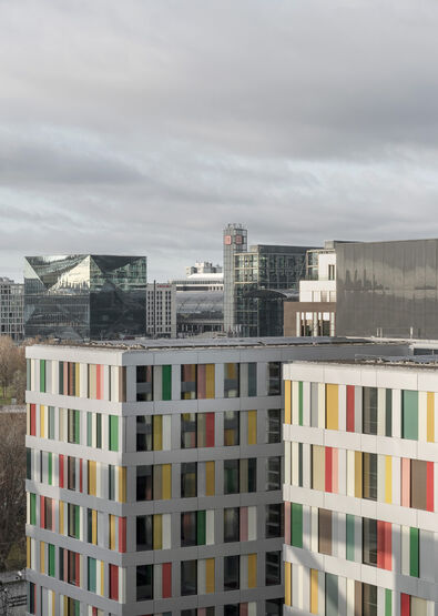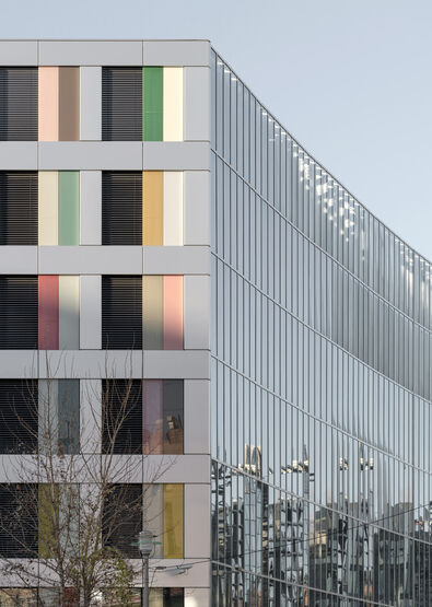 Äußerlich sind es die farbigen Fenster, die besonders ins Auge stechen. Die Berliner Architekten Sauerbruch Hutton sind für ihre Farbkonzepte bekannt. Schon einmal kamen bei ihrem Entwurf Glas Marte Produkte zum Einsatz: Am Luxemburger Standort der Unternehmensberatung Ernst & Young. Auch dort war Farbe ein prägendes Element der Architektur. Für das Fassadenkleid von Luise durften wir nun 1.300 farbige Flachglas-Scheiben fertigen. Das sind etwa 1.900 m² oder 59 t Einfachglas, 12 mm VSG/ESG sowie 12 mm ESG-H, jeweils mit speziellem Siebdruckmuster. Die zwölf verschiedenen Farbtöne wurden sehr sorgfältig ausgewählt, damit ein harmonisches Erscheinungsbild entsteht. Außerdem haben wir dafür extra Glashalter entwickelt, die genau auf die Einbausituation abgestimmt waren. Deren Montage erfolgte durch die Firma Kaufmann selbst. Die 18 × 19 m große Atriumfassade inklusive Stahl-Unterkonstruktion, Beschattungslamellen und RWA-Lüftungsflügeln wurde mit 96 UNIGLAS® Isolierglasscheiben verglast. Die Stahllamellen sind um 60 Grad geneigt und wurden so konzipiert, dass sie keinen Schlagschatten werfen. Nicht zuletzt waren wir an der 71 × 7 m großen Technikraumfassade beteiligt. Dabei handelt es sich um eine vorgehängte Glasfassade inklusive Alu-Unterkonstruktion, bestehend aus GM ESG-H COLORMART®, die mit dem UNIGLAS® GLASSICS-U RANDVERBUNDHALTER befestigt wurden.