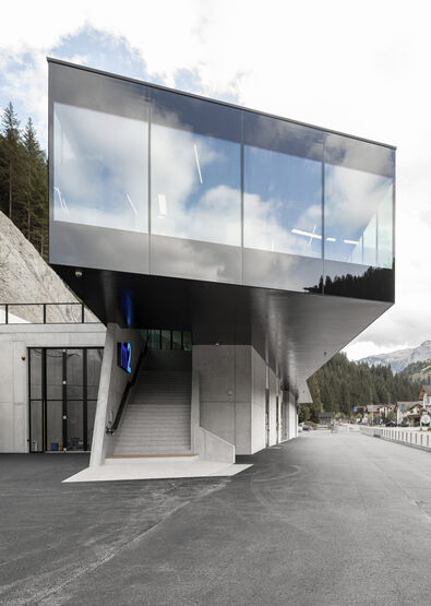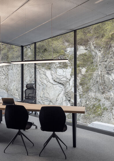 Anstatt baulich in die Natur einzugreifen, schmiegt sich das Objekt seitlich an den Berg, folgt in seiner Form den natürlichen Gegebenheiten: Auf den ersten Blick ist der leichte Knick im Obergeschoss kaum wahrnehmbar und doch vorhanden. Die Büros im Obergeschoss bieten Ausblicke auf die steinige Felswand und die bewaldeten Hügel im Umland. Ihre Entsprechung findet die umgebende Natur in der Gestaltung der Räumlichkeiten im Inneren – ganz in Erdtönen gehalten. Die Planer entschieden sich für den großzügigen Einsatz von Fenstern: Über die gesamte Länge des auskragenden Oberbaus erstreckt sich eine Fensterfront wie aus einem Guss. Nur unterbrochen durch äußerst schmale Fensterprofile. Deren schwarze Farbe wurde auch im unteren und oberen Bereich des Fensterglases aufgenommen, um die Boden- und Deckenkonstruktion zu verbergen. Ergebnis ist ein Stockwerk komplett aus Glas. In der Außenfassade spiegeln sich Berge und Himmel – damit ist die scheinbare Verschmelzung von Außen- und Innenbereich komplett.
