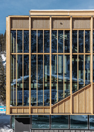 Das neue Gemeindezentrum fügt sich an der engsten Stelle des Ortes zwischen Schlegelkopf und Kirchhügel in die malerische Talschaft von Lech ein. Dem Architekten Christian Matt schwebte eine Architektur vor, die sich mit der besonderen Topografie vor Ort auseinandersetzt. Dies spiegelt sich in der Wahl der Materialien wider. Die Verwendung von lokalem Holz bei der Fassade referiert auf die in Vorarlberg verankerte Holzbaukunst, während die moderne Interpretation und die Integration von UNIGLAS® SUN GM CLIMATE dem Projekt einen zukunftsweisenden Charakter verleihen.