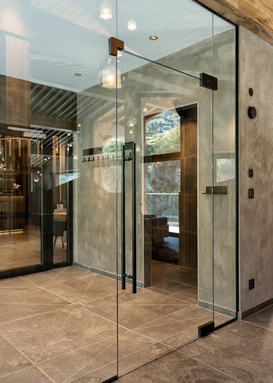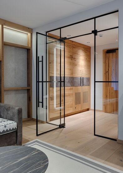 Die GM MARTITION MONO MIT GM ZARGENPROFILE tragen im öffentlichen Bereich zu einer eleganten Raumaufteilung bei, ohne die Großzügigkeit des Raumes zu beeinträchtigen. Klare Sichtachsen und der gezielte Einsatz von Glas schaffen ein einladendes Ambiente mit natürlicher Lichtdurchflutung. In den privaten Gästezimmern setzt satiniertes Glas gezielt Akzente, indem es Sichtschutz bietet und gleichzeitig eine warme, einladende Atmosphäre schafft.