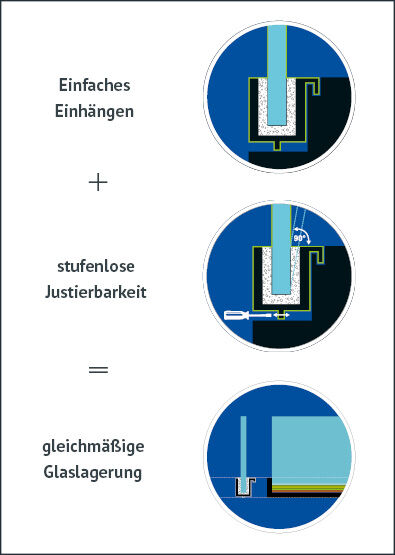 Durch das Modulprinzip wird das Glas in die Unterkonstruktion eingehängt und fixiert. Stufenlose Justierbarkeit des Ganzglasgeländers.