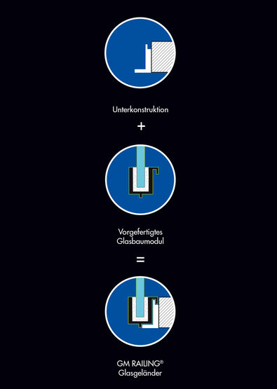 Das Ganzglasgeländer GM RAILING® besteht im Wesentlichen aus einem Glasbaumodul (Glas + Profil bereits werkseitig miteinander verbunden) und einem Unterkonstruktionsprofil.